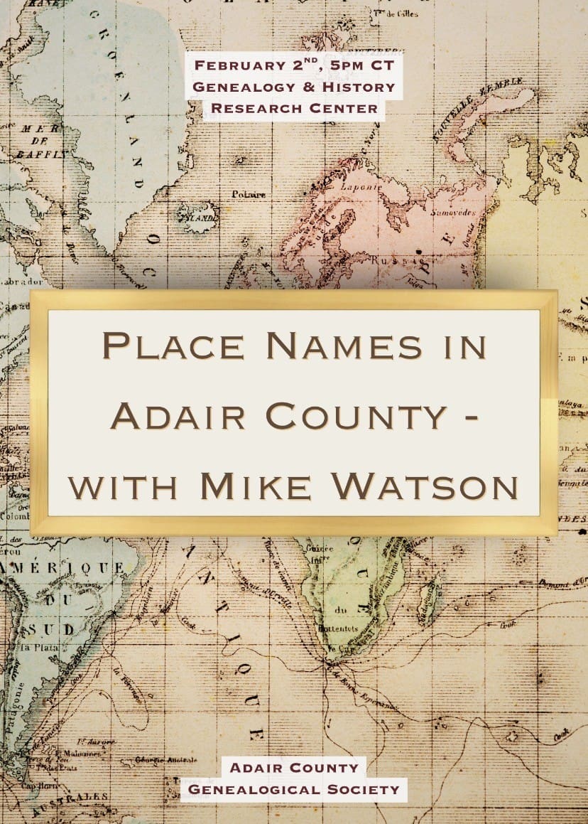 Adair County Genealogical Society February Meeting: “Place Names In Adair County With Mike Watson”