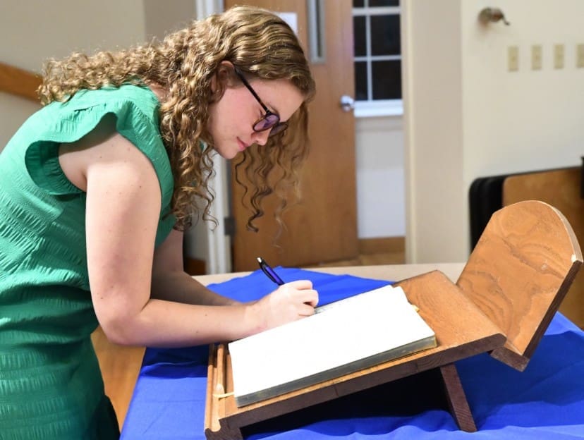 Lindsey Wilson University student Jaydelynn Woodall ’27 of Science Hill, Kentucky, signs her name into the Lindsey Wilson chapter book of Psi Chi, the international psychology honor society. It was part of the chapter’s induction ceremony of 12 new members on Thursday evening, Nov. 6, in W.W. Slider Humanities Center Recital Hall.
