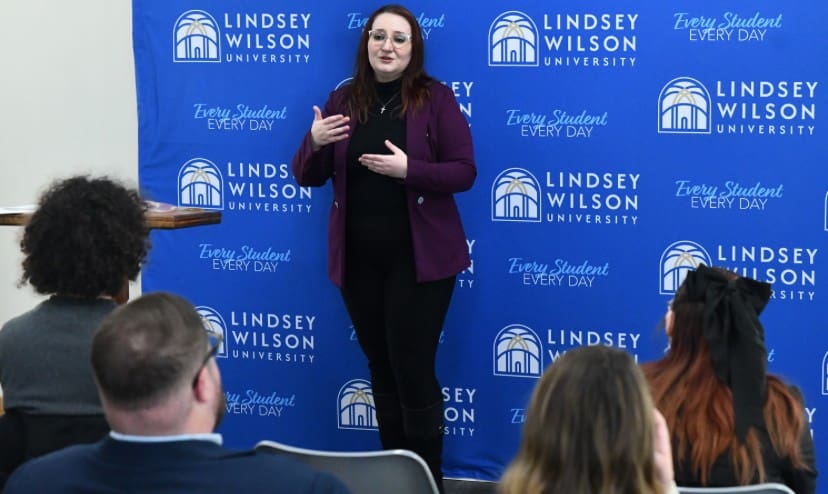 Makayla Wright ’24 of Campbellsville, Kentucky, delivers the keynote talk to members of the Lindsey Wilson University Xi Psi chapter of Lambda Pi Eta, the National Communication Association’s official honor society at four-year colleges and universities. A total of 13 new members were inducted into the LWU chapter on Wednesday, Dec. 3, in J.L. Turner Leadership Center.