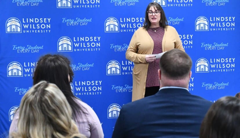 Lindsey Wilson University communication professor Jennifer Furkin addresses members of the Xi Psi chapter of Lambda Pi Eta, the National Communication Association’s official honor society at four-year colleges and universities. A total of 13 new members were inducted into the LWU chapter on Wednesday, Dec. 3, in J.L. Turner Leadership Center.