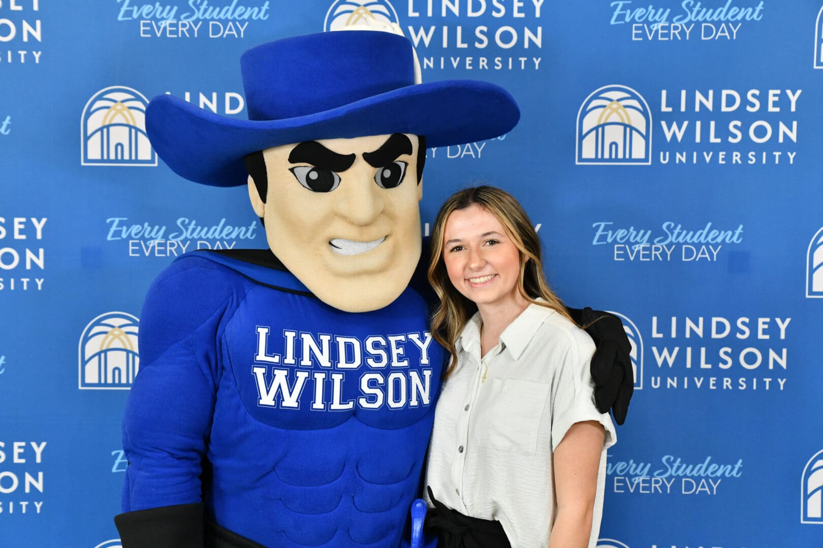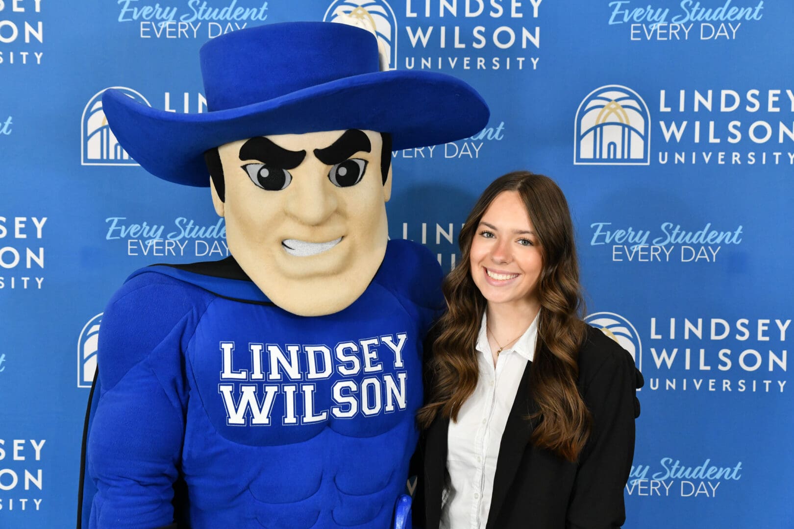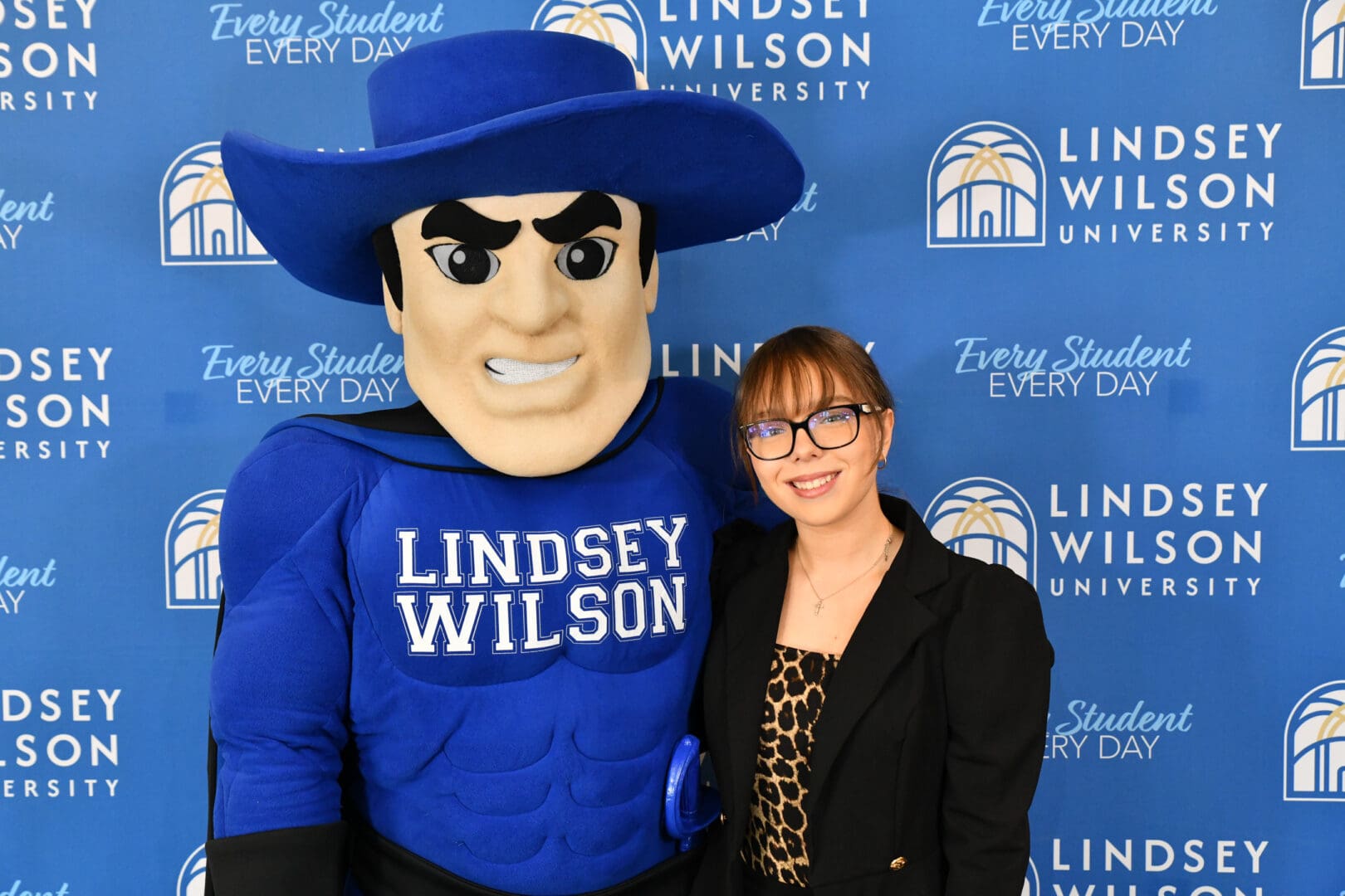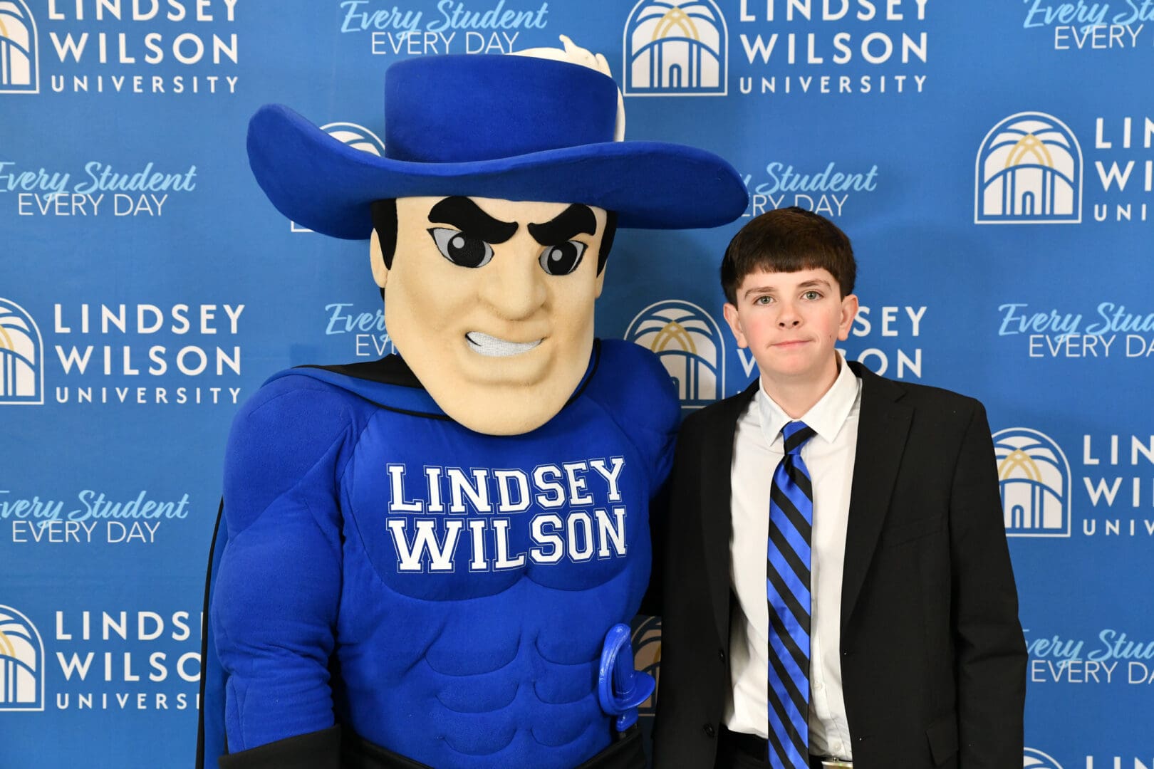 Adair County High School senior Creedence Wolfgang, pictured with Lindsey Wilson University mascot Blue Raider Bob, participated in the 2026 Lindsey Wilson University John B. Begley Scholars Day, held Feb. 7.