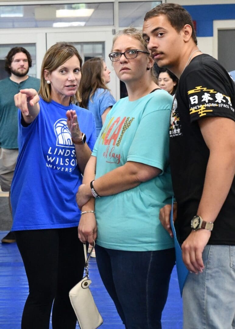 Lindsey Wilson University Director of Admissions Charity Ferguson ’01 instructs new Lindsey Wilson student Aiden Eastridge ’29 of Louisville, Kentucky, and his mother, Megan Fields, to the correct table in the Doris and Bob Holloway Health & Wellness Center during the final Lindsey Wilson New Student Orientation of the summer, held Friday, Aug. 8.