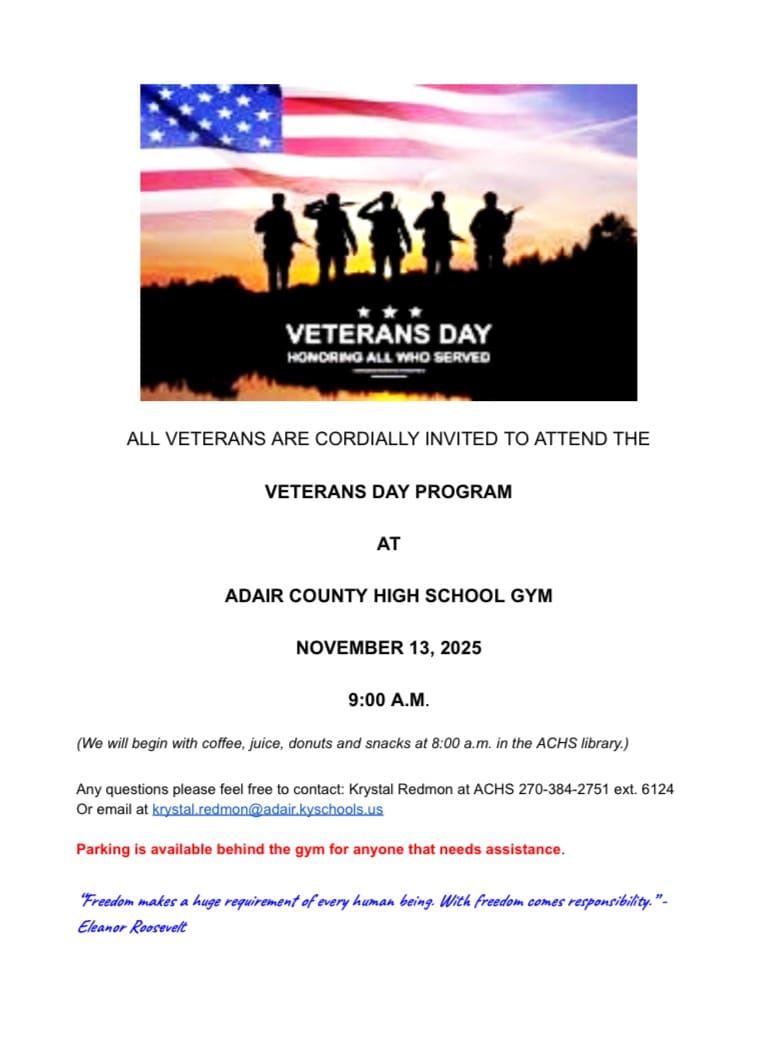 Adair County High School’s Veterans Ceremony Set For Thursday, November 13th