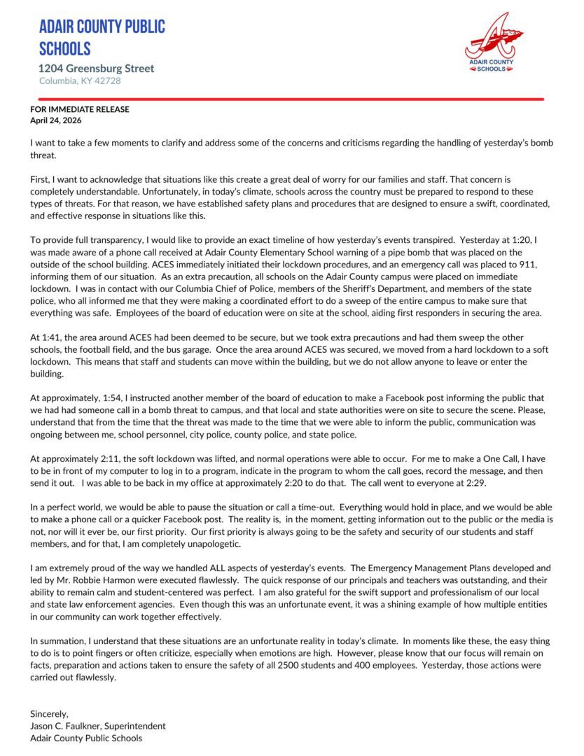 Adair County Schools: Clarifying And Addressing Concerns And Criticisms Regarding Handling Of Thursday’s Bomb Threat