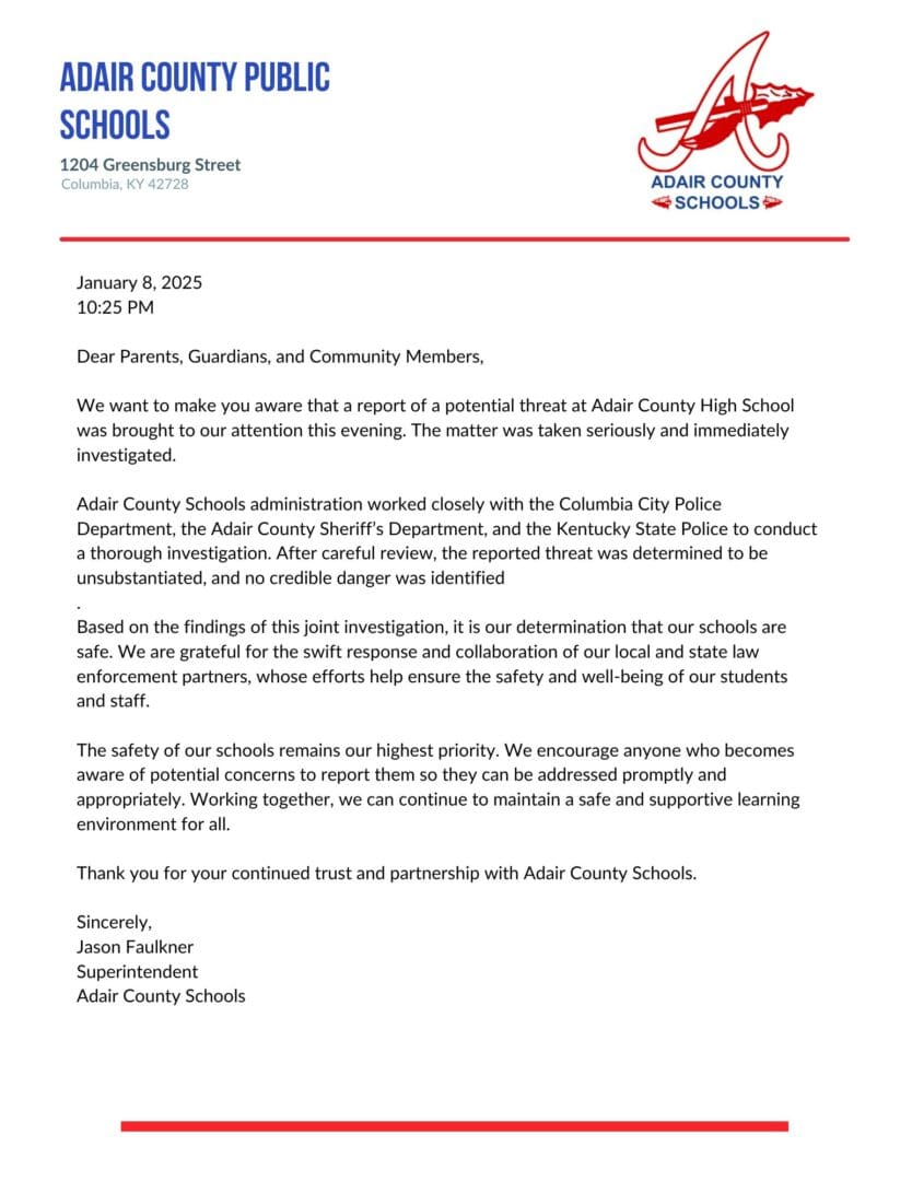 Adair County Schools Update: Potential Threat Investigated, Determined Unsubstantiated