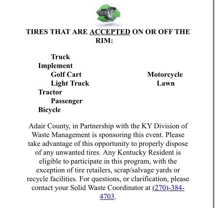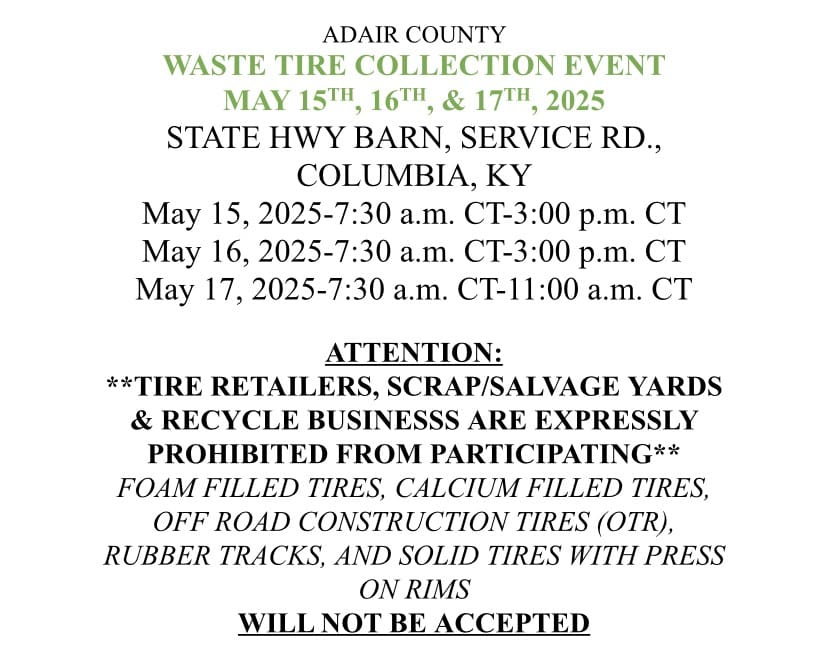 Adair County, in partnership with the KY Division of Waste Management is proud to announce the sponsorship of the Waste Tire Collection Event May 15th, May 16th, and May 17th, 2025.