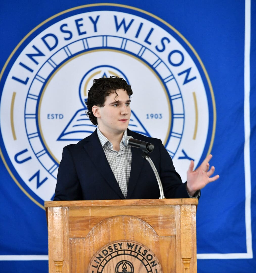 Lindsey Wilson University student Connor Wilhoit ’27 of Campbellsville, Kentucky, delivers the keynote remarks at the university’s John B. Begley Scholars Day on Saturday, Feb. 7, in the Robert D. Cranmer Dining & Conference Center. Wilhoit is a psychophysiology and history double major with plans to become a physical therapist.