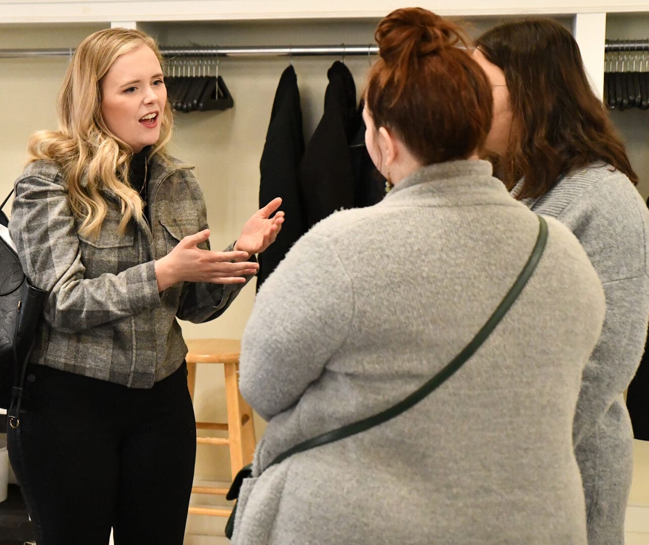 Shelby County (Kentucky) High School senior Laura Lauer, left, learns about Lindsey Wilson University’s choral program during the school’s John B. Begley Scholars Day on Saturday, Feb. 7, at an academic forum in the Robert D. Cranmer Dining & Conference Center. Speaking to Lauer are Lindsey Wilson Director of Choral Activities Jennifer Bersaglia, center, and Begley Scholar Anna Kate Alexander ’29 of Glasgow, Kentucky, who is a Begley Scholar and a member of the Lindsey Wilson Singers.