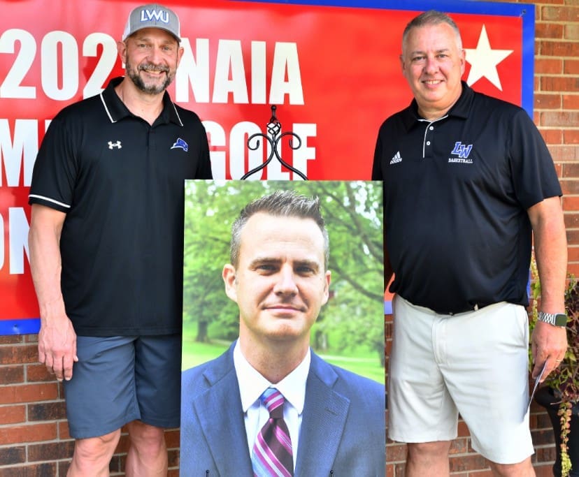Lindsey Wilson University Dean of Students Chris Schmidt, left, and men’s basketball coach Chris Starks flank a portrait of the late Brady C. Button ’98 on Friday, Sept. 19, at The Pines at Lindsey Wilson golf course. More than 80 people participated in the fourth-annual Brady Button Memorial Golf Scramble, held to raise money to support Lindsey Wilson students and the men’s basketball program.