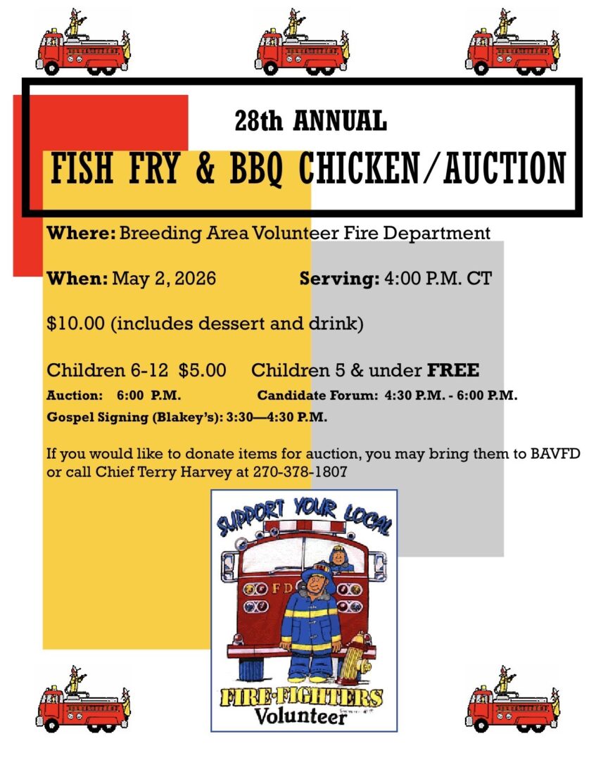 Breeding Area Volunteer Fire Department’s 28th Annual Fish Fry & Auction On Saturday, May 2nd