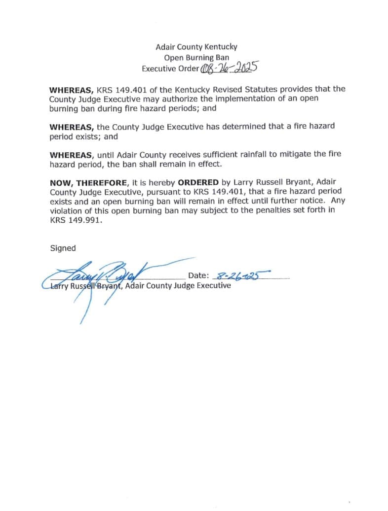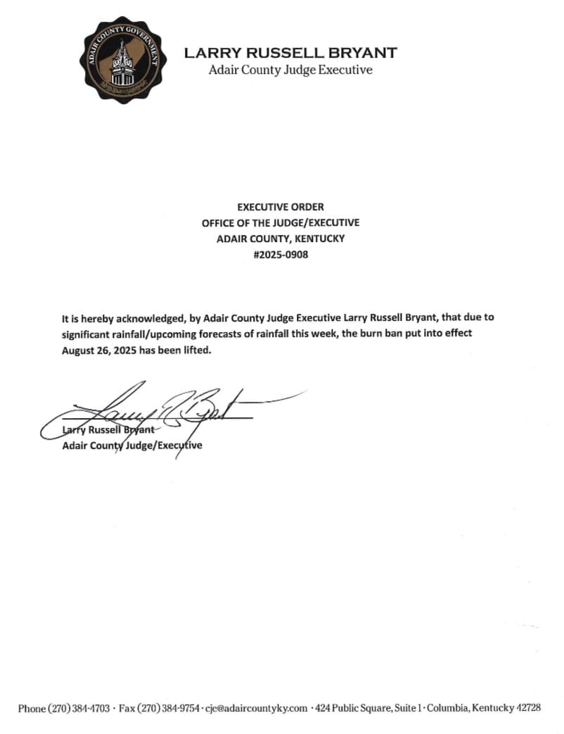 Executive order from Judge Executive Bryant lifting the burn ban effective today, Monday, September 8, 2025.