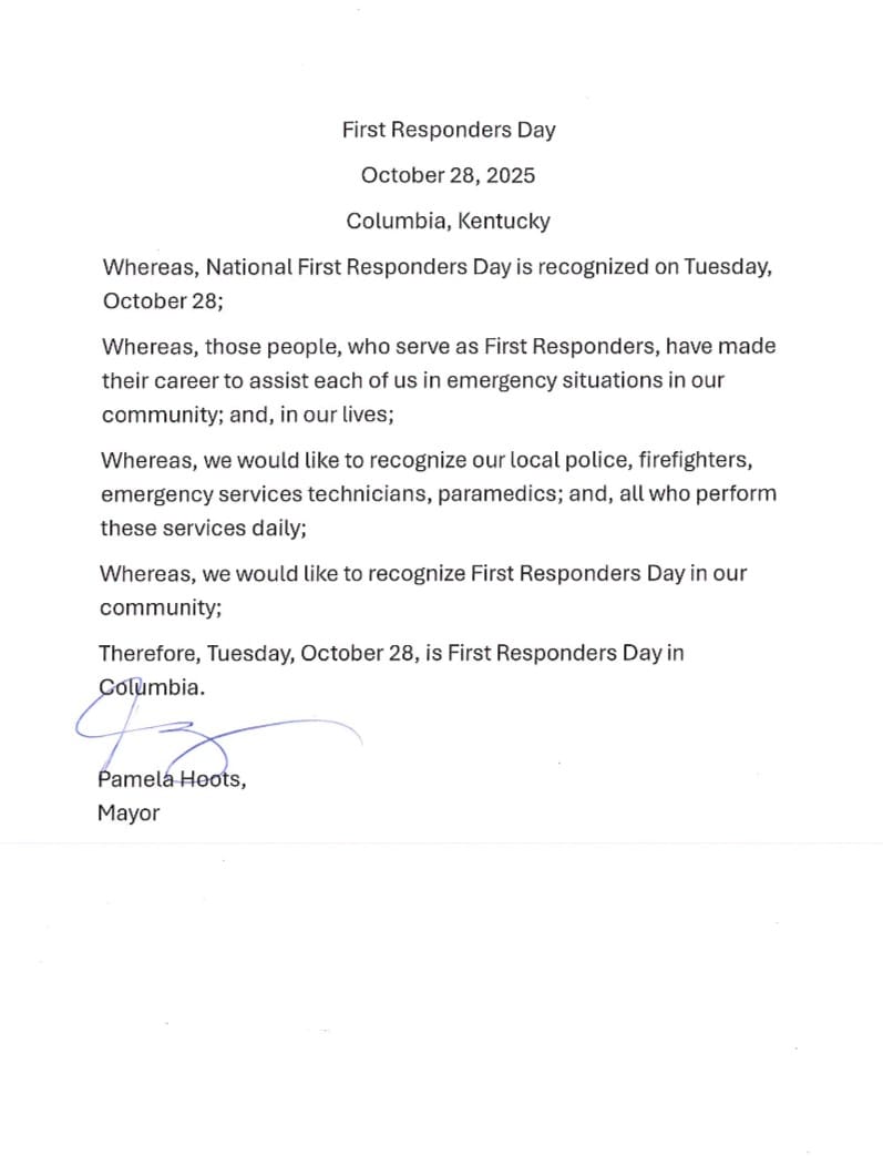The City of Columbia held a proclamation signing to declare First Responder Day in Columbia, in conjunction with national First Responders Day to be Tuesday, October 28th, 2025.