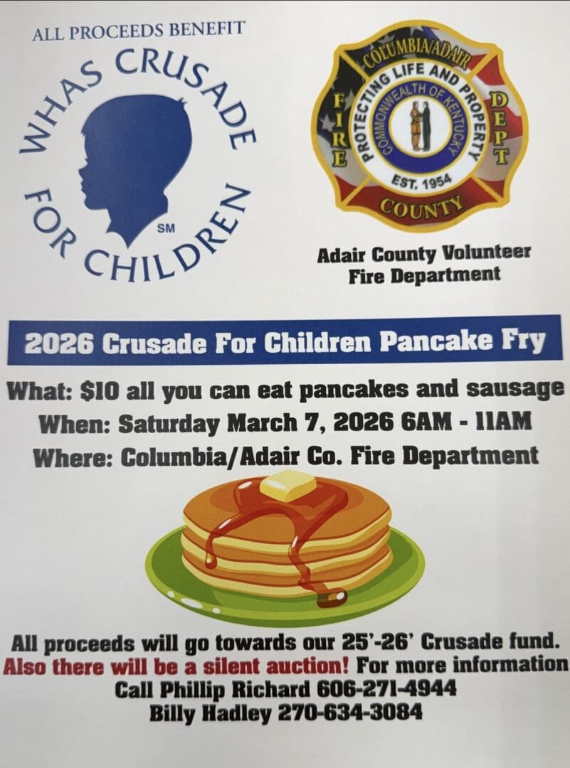 The Columbia Adair County Fire Department would like to invite everyone out to our Pancake Breakfast this Saturday, March 7, 2026, from 6:00 AM – 11:00 AM cst at the Fire Department, located at 200 Merchant Street in Columbia.