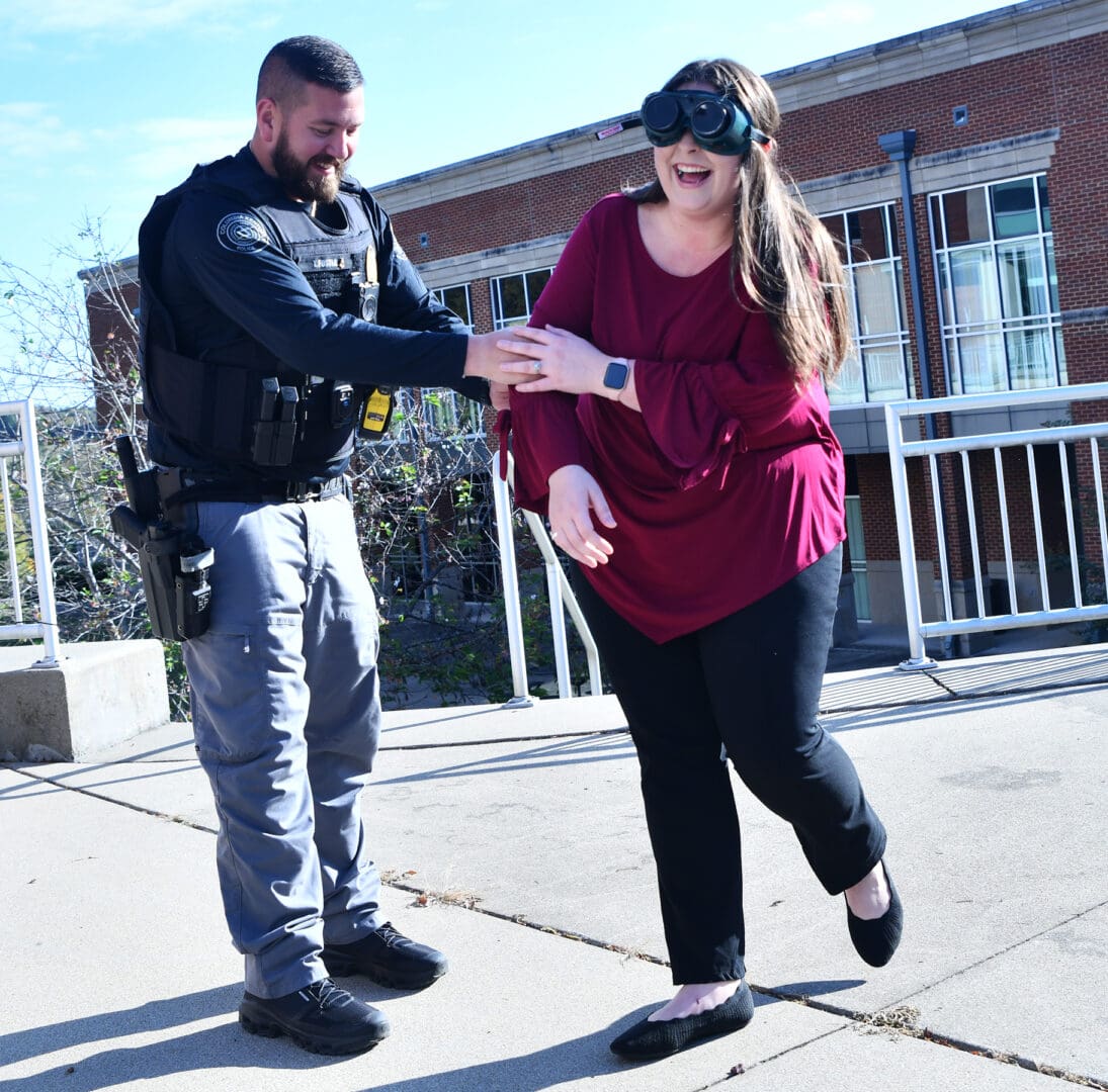 Lindsey Wilson University human services and counseling instructor Mahalia Cain is helped by Columbia Police Sgt. Trevor Foster while she wears a pair of alcohol-impairment simulation goggles during a “Substance Abuse” class on Thursday, Oct. 16.