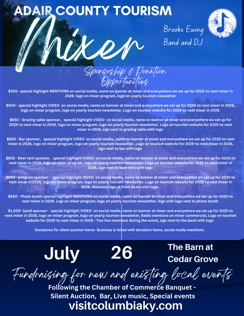 Thanks to Amy Mitchum at The Barn at Cedar Grove, the Mixer will be hosted there again this year following the Columbia Adair County Chamber of Commerce awards banquet and dinner. Brooks Ewing will be our entertainment for the night, with his live band and DJ… If you know Brooks you know you’re in for a great time.