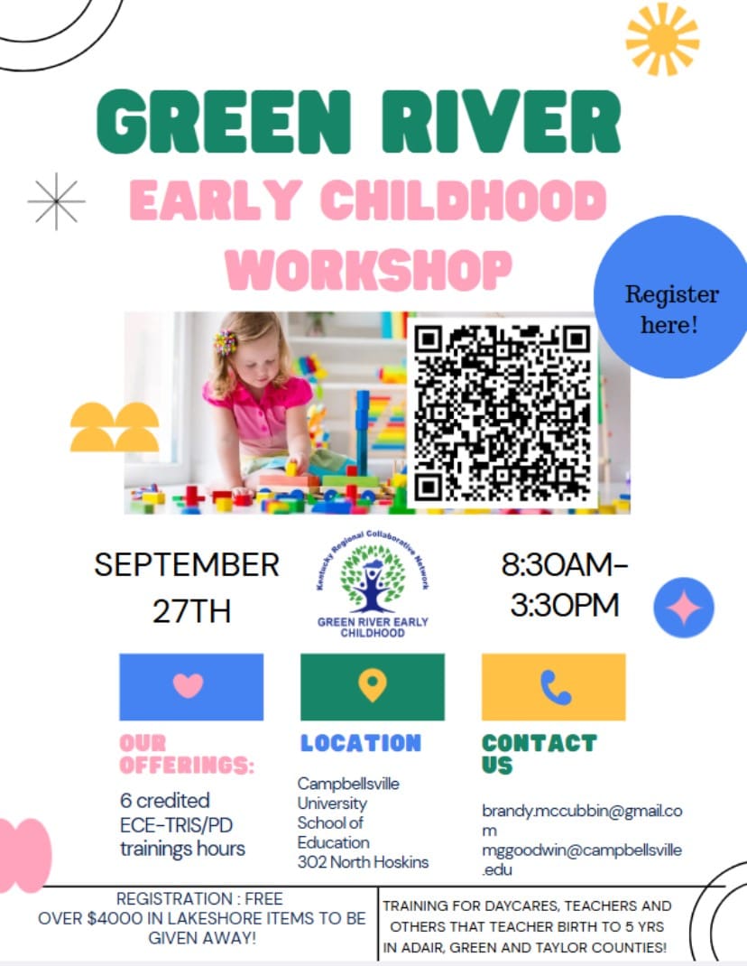 Attention: Adair, Green and Taylor County caretakers and teachers that work with children birth to 5 years of age! Check out this FREE workshop!!! We will be giving over $4000 away in educational prizes and you will earn 6 ECE-TRIS training hours!!