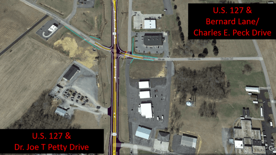 Left turn lanes will be added to U.S. 127 at Charles E. Peck Drive/Bernard Lane. And, left turn lanes will be constructed on KY 619 at the intersection of U.S. 127, which will include a new protected/permitted left turn signal with a green arrow that indicates drivers can make left turns while all other traffic is stopped.