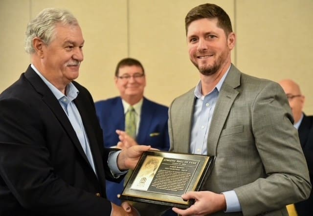 Former Lindsey Wilson University baseball coach Mike Talley ’91, right, welcomes his former player Trent Coffee ’01 into the LWU Athletics Hall of Fame during the induction ceremony, held Saturday, Sept. 13, at Robert D. Cranmer Dining & Conference Center. Talley was inducted into the Hall of Fame in 2018.