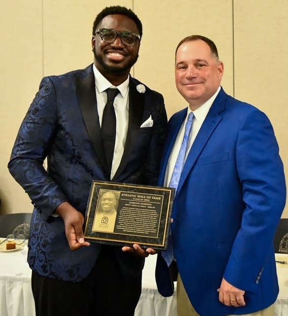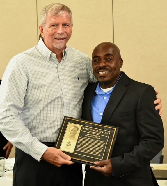 Lindsey Wilson University Athletic Director Willis Pooler ’93, right, welcomes former track and field standout and coach Jamaine Gordon ’07 into the LWU Athletics Hall of Fame during the induction ceremony, held Saturday, Sept. 13, at Robert D. Cranmer Dining & Conference Center.