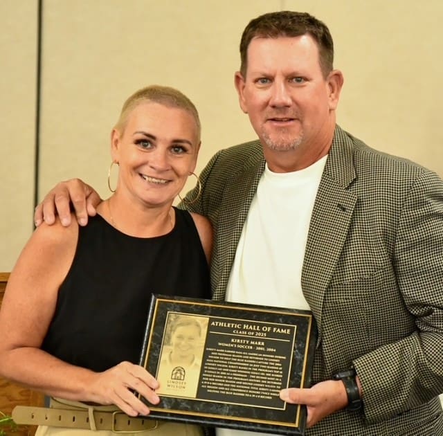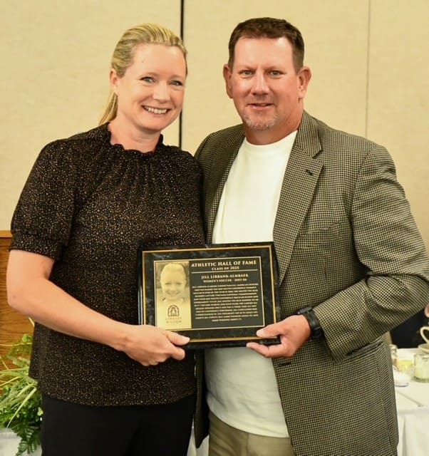 Lindsey Wilson University women’s soccer coach Drew Burwash ’94 welcomes his former player Jill Lirbank-Almbaek Fitzgerald ’06 into the LWU Athletics Hall of Fame during the induction ceremony, held Saturday, Sept. 13, at Robert D. Cranmer Dining & Conference Center. Burwash was inducted into the Hall of Fame in 2004.