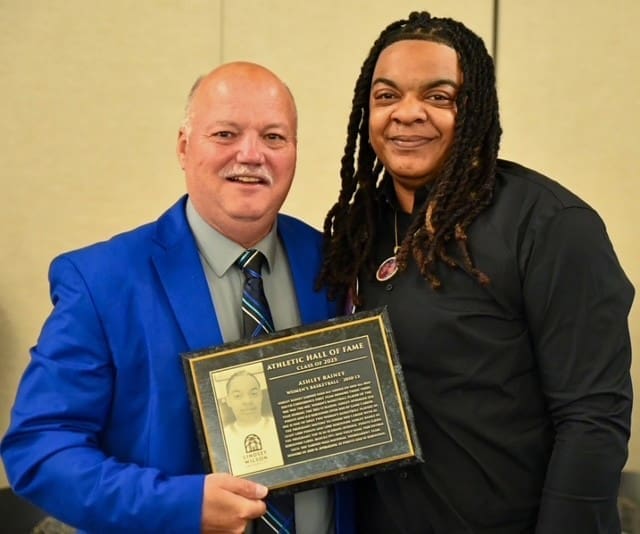 Lindsey Wilson University women’s basketball coach John Wethington ’84 welcomes his former player Ashley Rainey ’13 into the LWU Athletics Hall of Fame during the induction ceremony, held Saturday, Sept. 13, at Robert D. Cranmer Dining & Conference Center.