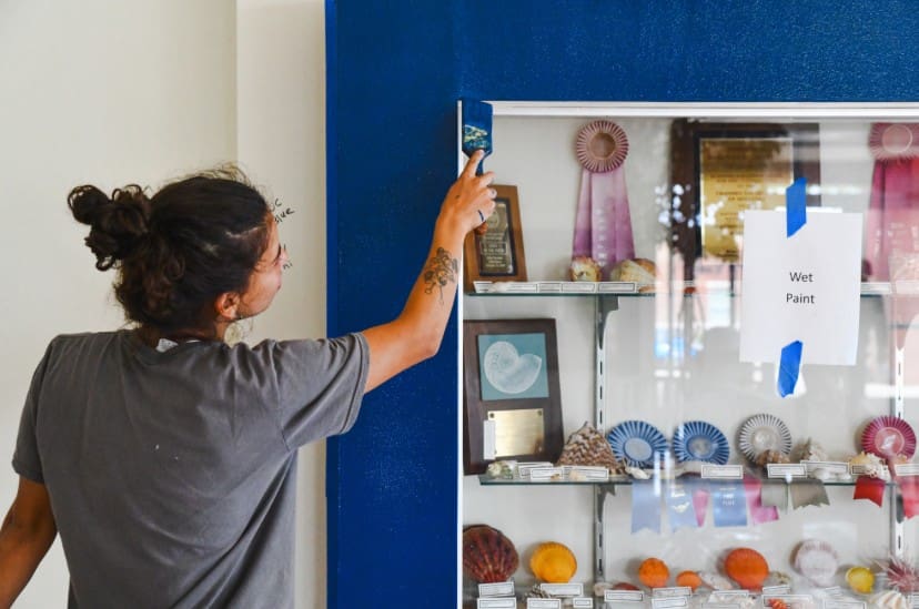 Lindsey Wilson University student employee Amanda Parreiras ’26 of Belo Horizonte, Brazil, puts a fresh coat of Lindsey Blue on Tuesday, July 29, on a wall in the atrium of the Roberta D. Cranmer Dining & Conference Center.
