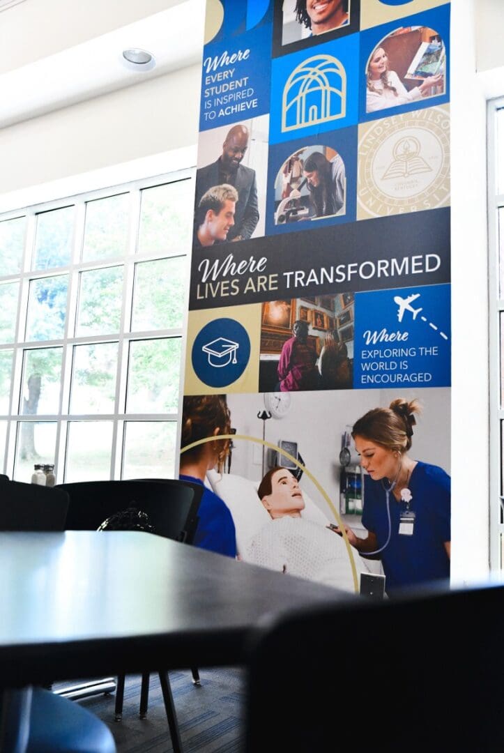 Several dozen “Lindsey Wilson University: Every Student, Every Day” banners have been attached to campus lightpoles, a “Lindsey Wilson University” sign now greets visitors on the east (William and Young streets) and west (Fairgrounds and Lindsey Wilson streets) entrances to campus. The interior walls of the Roberta D. Cranmer Dining & Conference Center and Cralle Student Union Building are being painted with the colors Lindsey Blue and Lindsey Navy, and several wall treatments have been installed in the Cranmer Dining & Conference Center.