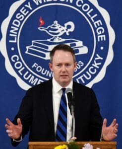 Dunn spoke to Lindsey Wilson supporters, faculty, staff and students less than half an hour before the Lindsey Wilson Board of Trustees unanimously voted to rename the school Lindsey Wilson University, effective July 1.