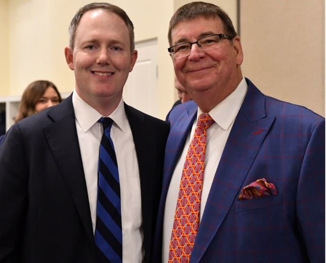 Lindsey Wilson College President William T. Luckey Jr., right, joins Kosair for Kids President and CEO Barry Dunn ’05, who delivered the 2025 Lindsey Wilson Founders’ Day Celebration keynote address on Thursday, April 24, at Roberta D. Cranmer Dining & Conference Center.