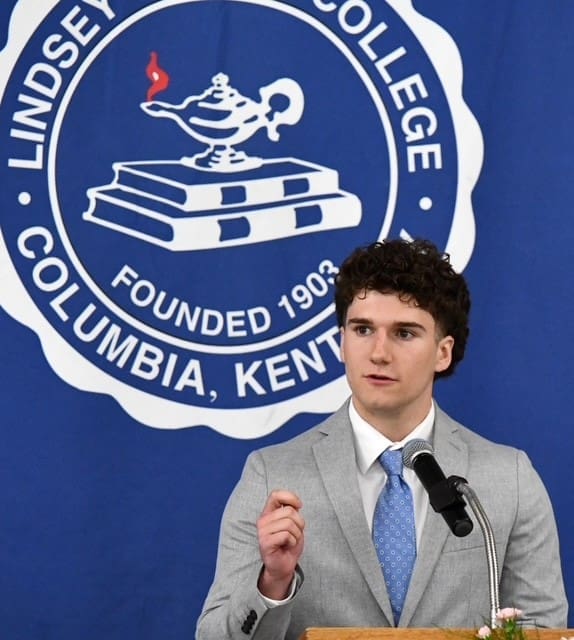 Lindsey Wilson College student Connor Wilhoit ’26, a psychophysiology major from Campbellsville, Kentucky, delivers one of two student addresses at the 2025 Lindsey Wilson Founders’ Day Celebration on Thursday, April 24, at Roberta D. Cranmer Dining & Conference Center.