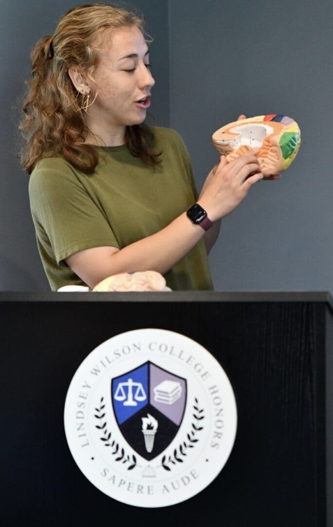 Lindsey Wilson College student Zoe Wilson ’26, an elementary education major from Rineyville, Kentucky, holds a model of the human brain while presenting her research project, “The Active Brain: How Exercise Impacts Brain Function and Literacy Instruction,” at the 2025 Spring Symposium of the Lindsey Wilson R.V. Bennett Honors Program on Thursday, April 17, at the Honors House.