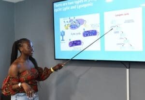 Lindsey Wilson College student Maufinda Howard ’26, a biology major from Campbellsville, Kentucky, makes a point about phage while presenting her research project, “Bacteriophages: A Solution to the Antibiotic-Resistant Problem in the World,” at the 2025 Spring Symposium of the Lindsey Wilson R.V. Bennett Honors Program on Thursday, April 17, at the Honors House.
