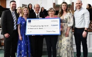 Lindsey Wilson College music professor and director of choral programs Gerald Chafin and his wife, Sonja, accept a facsimile check representing the Dr. Gerald and Sonja Chafin Music Endowment. The $110,000 endowment gift will be used to support the Lindsey Wilson Singers, which the Chafins led for 28 years. From left: Benson Sexton ’04, Allison Chafin Thrower ’13, Gerald Chafin, Sonja Chafin, Allysa Gooden ’08 and Tyler McCubbins ’09.