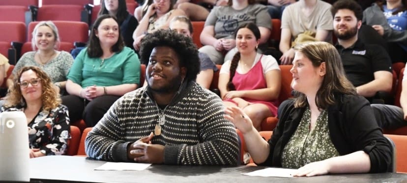 Lindsey Wilson College college students Leeshawn Johnson ’26, a theatre major from Louisville, Kentucky, and Morgan Bryant ’26, an English major from Shelbyville, Kentucky, interview award-winning actor, director and writer Ruben Santiago-Hudson Monday evening in W.W. Slider Humanities Center Recital Hall.