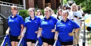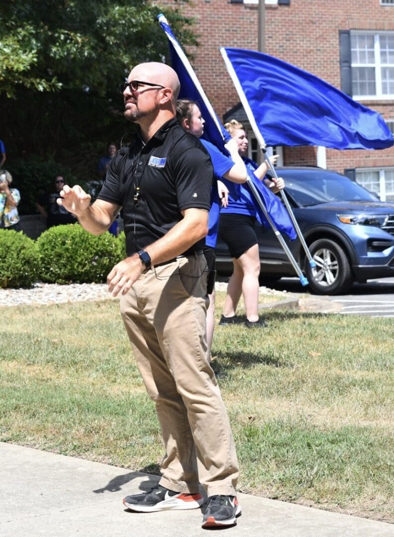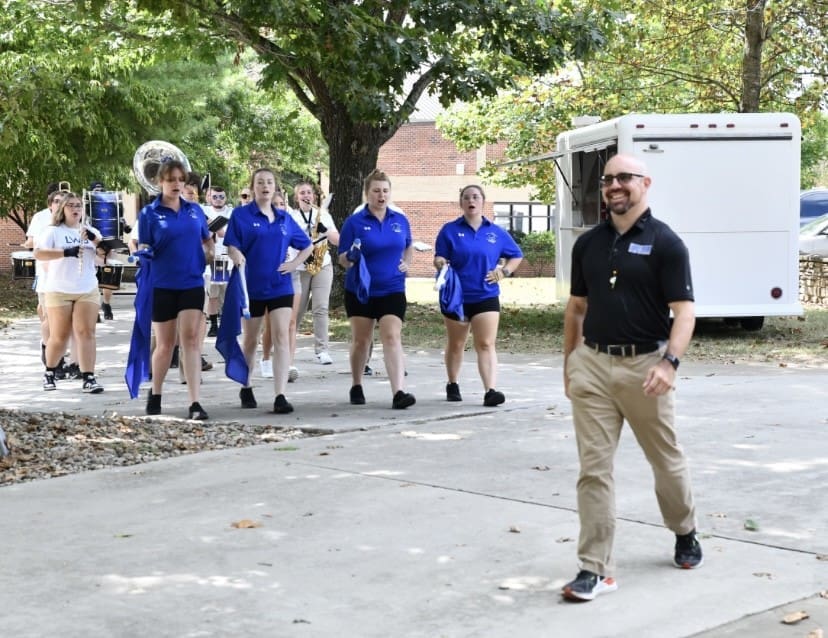 Lindsey Wilson University Director of Bands Robert Palmer leads the Blue Raider Band across campus during move-in day on Saturday, Aug. 23. The Blue Raider Band will make its 2025 halftime debut at the Thursday, Aug. 28, Lindsey Wilson-Texas Wesleyan University 6 p.m. CT game at Parnell Family Stadium.