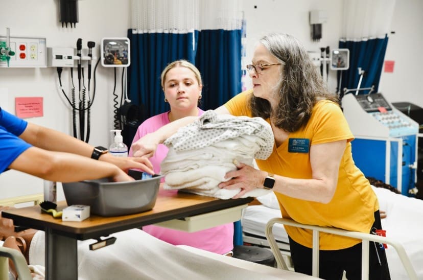 Lindsey Wilson University nursing student Madilyn Schultz of Elizabethtown, Kentucky, observes nursing professor Dr. Susan Vickous during nursing boot camp on Tuesday morning in the Dr. Robert and Carol Goodin Nursing & Counseling Center.
