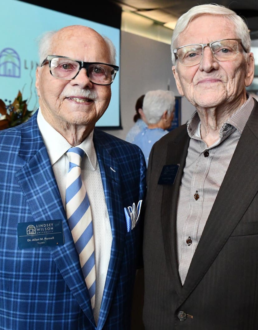 Lindsey Wilson University trustee Dr. Allan M. Parnell, left, and former Lindsey Wilson College President John B. Begley were among those who attended the Lindsey Wilson University celebration on Tuesday, July 1, at the Speed Art Museum in Louisville, Kentucky. An Adair County native, Parnell was the longest-serving chairman of the Lindsey Wilson College Board of Trustees, and Begley was Lindsey Wilson’s sixth president from 1977-97.
