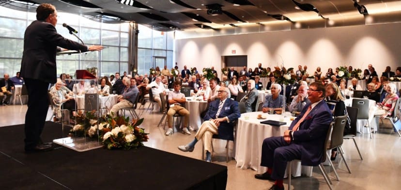Lindsey Wilson University trustee David Perry addresses a standing room only audience on Tuesday, July 1, at the Speed Art Museum in Louisville, Kentucky, to celebrate the school’s first day as a university.