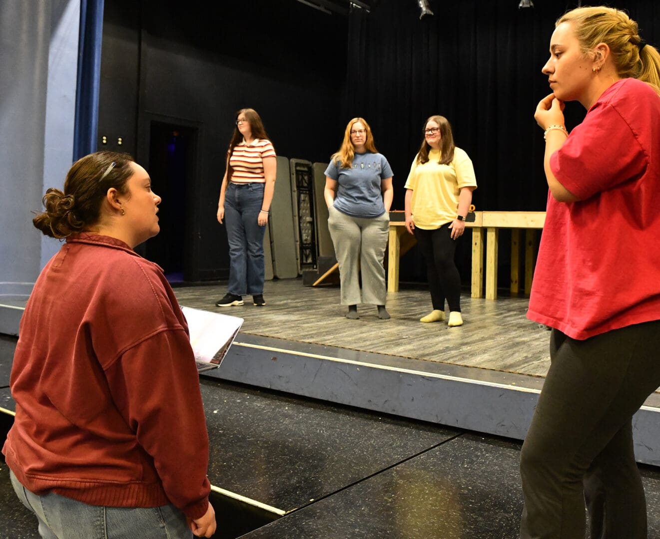 Lindsey Wilson University theatre graduate assistant Kassidy Phelps ’24, left, confers with Reilly Wells ’26 of Columbia during a rehearsal of “A Grand Night for Singing,” which will be presented March 26-27 and March 29 at V.P. Henry Auditorium.