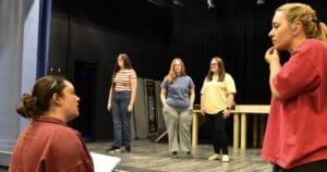 Lindsey Wilson University theatre graduate assistant Kassidy Phelps ’24, left, confers with Reilly Wells ’26 of Columbia during a rehearsal of “A Grand Night for Singing,” which will be presented March 26-27 and March 29 at V.P. Henry Auditorium.