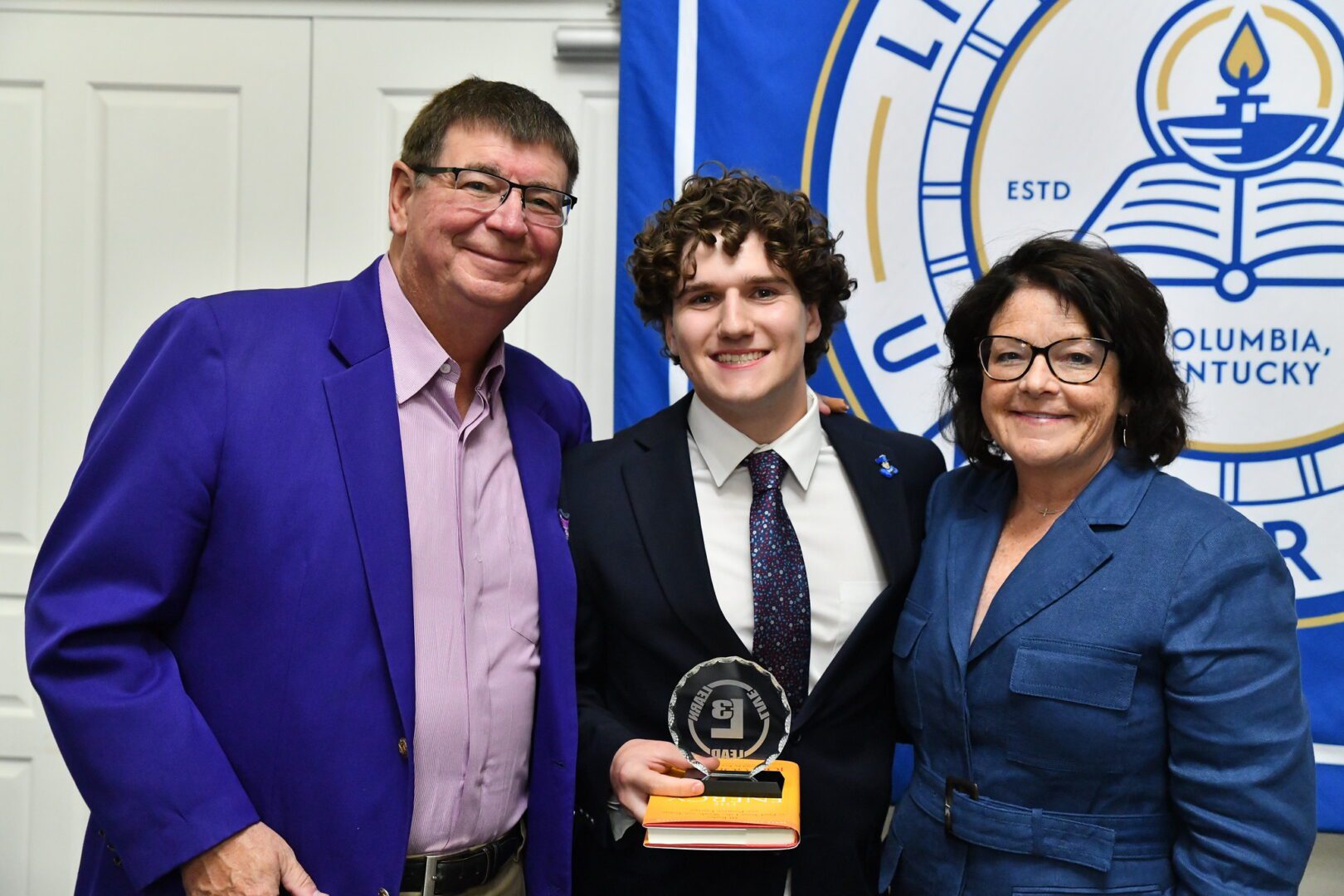 Lindsey Wilson University President William T. Luckey Jr. presents one of the university’s three L3 Awards to Connor Wilhoit, middle, a psychophysiology and history double major from Campbellsville, Kentucky. Wilhoit was nominated to receive the L3 Leadership Award by LWU Dean of Admissions Traci Pooler, right. The L3 Award recognizes Lindsey Wilson students and employees who exemplify the spirit to live, learn and lead in their daily work.