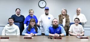 Members of the Lindsey Wilson University National Alumni Association gather for the organization’s winter meeting on Saturday, Feb. 28, in the board room of the university’s Roberta D. Cranmer Dining & Conference Center. Front row, from left: Patrick Adkins ’19, community representative; Alex Strein ’15, past-president; Tanner Strein ’13, president; and Kimberly Harden ’22, secretary. Back row, from left: Director of Alumni Relations Allison Cross ’09; Linda King ’67, trustee; Gary Franklin ’94; Jeannie Squires ’72; and Ben Burr ’64. Not pictured are members who attended the meeting virtually: Kailyn Conner ’14; Carrie Farris ’67, community representative and trustee; Sarah Mitchell ’10; Suzy Pitman ’16; Sarah Mitchell ’10; Vice President for Development Kevin Thompson.