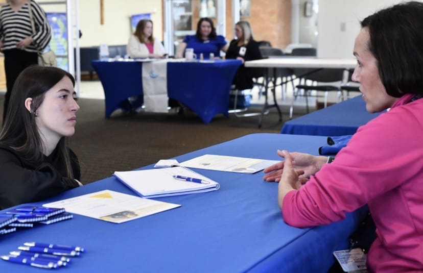 Lindsey Wilson University nursing student Kaylyn Smith ’26 of Campbellsville, Kentucky, left, speaks with Dana Meiklereid, senior recruiter with Norton Healthcare Human Resources of Louisville, Kentucky, at the LWU Nursing Fair, held Friday, Feb. 27, at the university’s Norma and Glen Hodge Center for Discipleship.