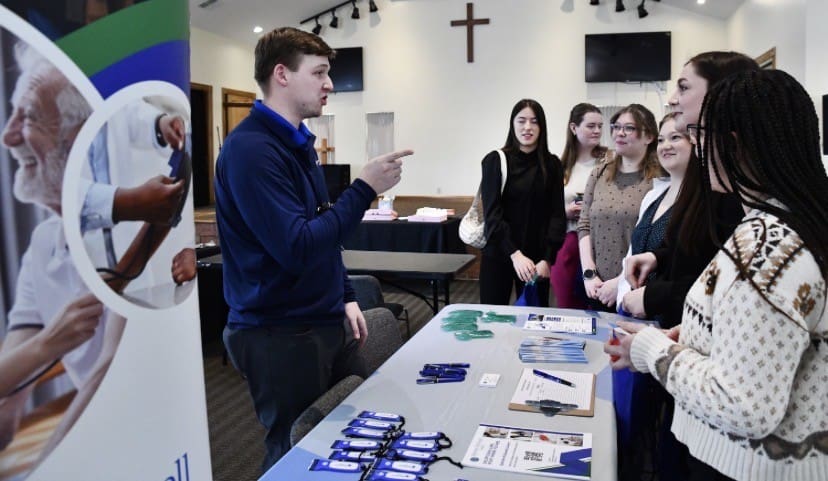 Mitchell Wiese, a talent acquisition specialist with Ephraim McDowell Health of Danville, Kentucky, speaks with Lindsey Wilson University nursing students at the LWU Nursing Fair, held Friday, Feb. 27, at the university’s Norma and Glen Hodge Center for Discipleship.