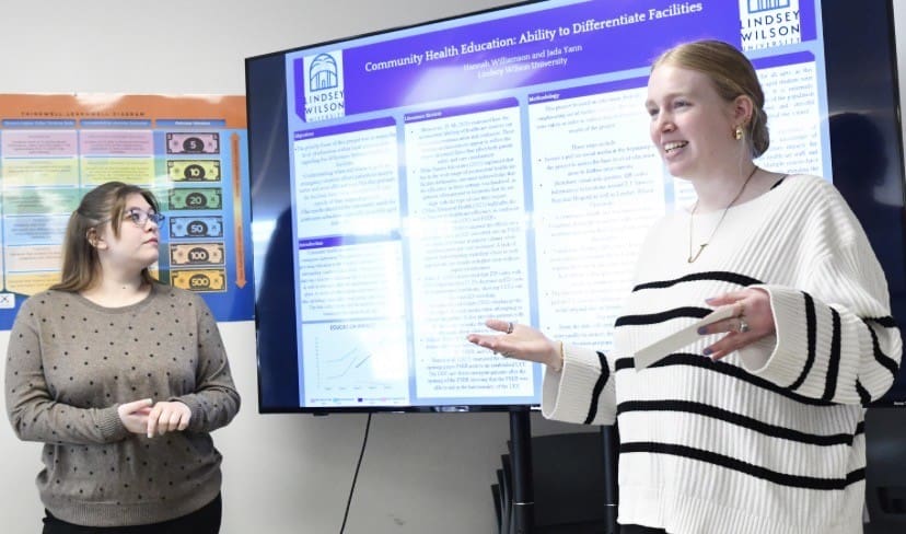 Lindsey Wilson University nursing majors Hannah Williamson ’26 of Munfordville, Kentucky, left, and Jada Yann ’26 of Louisville, Kentucky, discuss their research about community health education on Friday, Feb. 27, at the university’s Dr. Robert and Carol Goodin Nursing & Counseling Center. Their research was one of the program’s competency-based education projects that helps nursing majors better understand the health care profession.