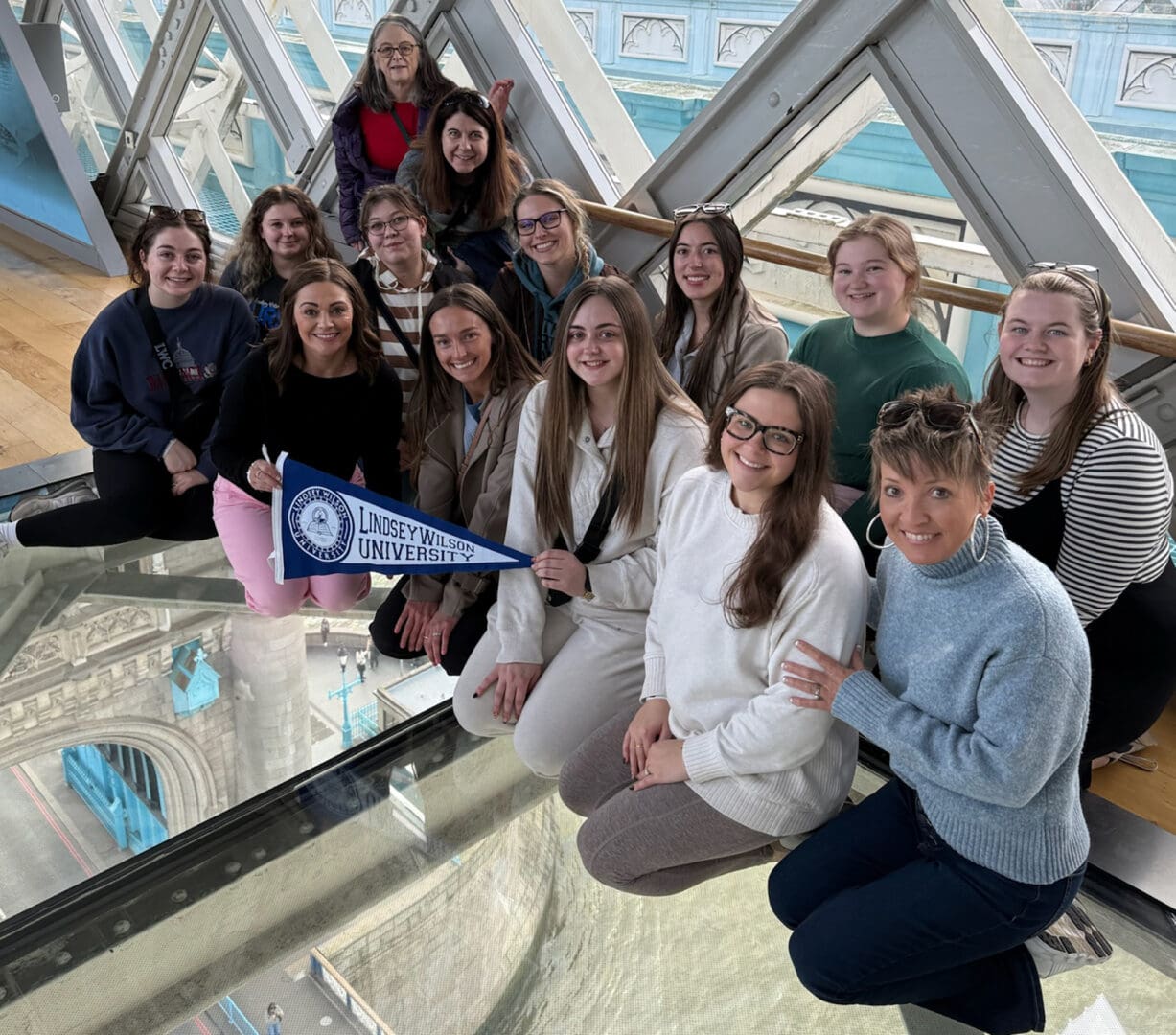 Students and faculty members of the Lindsey Wilson University gather on the Tower Bridge glass walkway in London on their study-abroad trip to London and Paris during the university’s spring break. The walkway is about 110 feet (33.5 meters) above Tower Bridge Road, which runs above the River Thames.