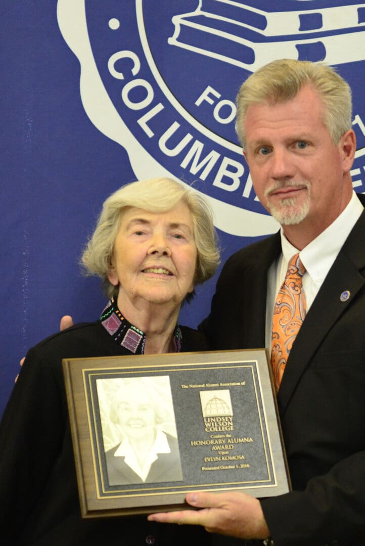 Adair County native Evlyn Komosa is presented the Lindsey Wilson Honorary Alumna Award by Lindsey Wilson Vice President of Development Kevin A. Thompson at the school’s 2016 homecoming.