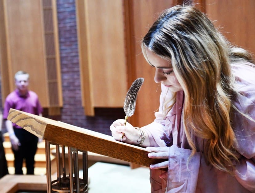 Lindsey Wilson University Singer Reilly Wells ’26 of Columbia signs the group’s “Standards of Excellence” during the signing ceremony, held Tuesday, Sept. 23, in the university’s John B. Begley Chapel.