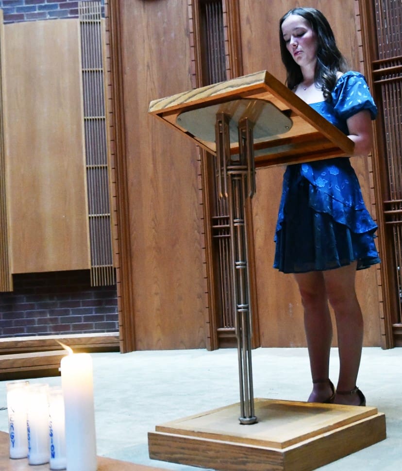 Lindsey Wilson University Singers officer Sadie Kemp ’26 of Columbia speaks about the pillar passion — one of the musical ensemble’s three foundational pillars — at the group’s annual Standards of Excellence Signing Ceremony, held Tuesday, Sept. 23, in the university’s John B. Begley Chapel.