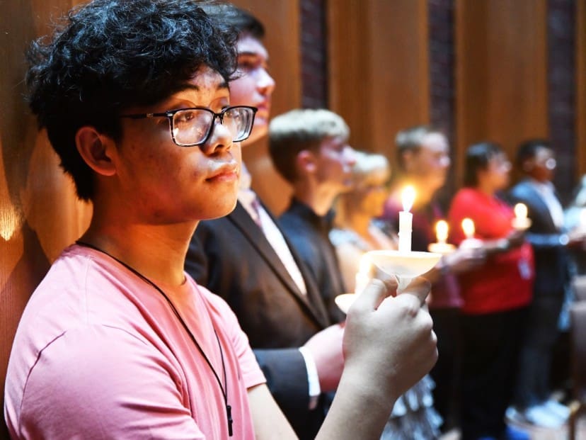 Lindsey Wilson University Singer Yesh Singayao ’27 of Vine Grove, Kentucky, holds a candle while standing against an interior wall of the John B. Begley Chapel during the Singers’ Standards of Excellence Signing Ceremony, held Tuesday, Sept. 23.